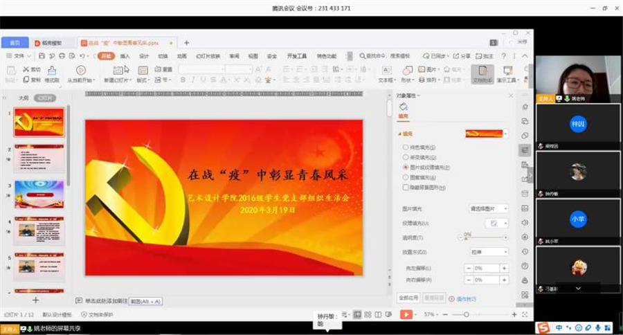为充分发挥基层组织在疫情防控阻击战中的战斗堡垒作用和党员先锋模范作用,进一步落实上级关于疫情防控的重要指示精神,推进疫情防控工作,3月19日下午,bevictor伟德官网16级员工党支部通过线上平台集中召开了“在战‘疫’中彰显青春风采”组织生活会,传达了公司党委关于疫情期间的相关要求,会议由支部书记姚安贤主持。