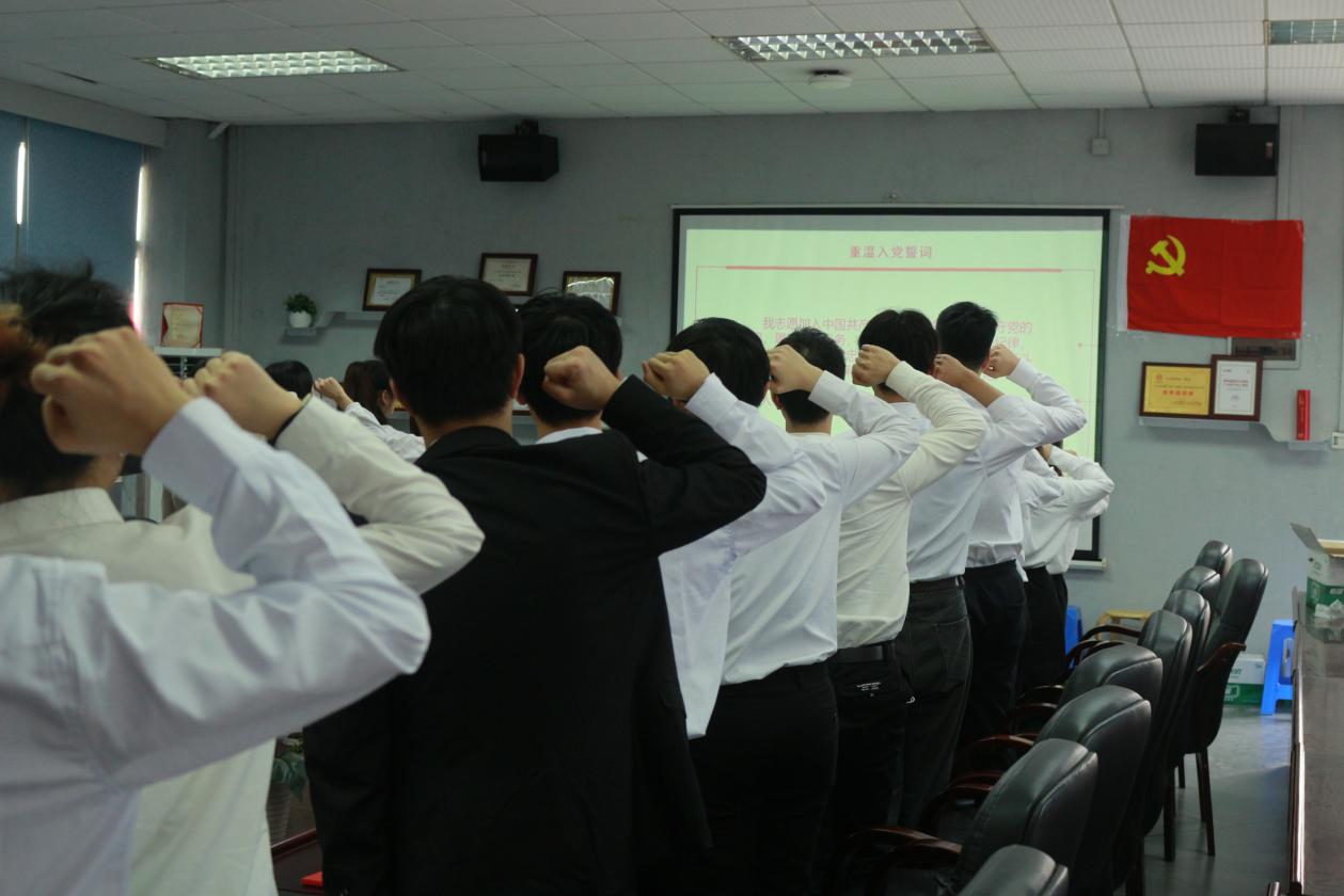 夏楚悦同志与与会党员分享“何为政治生日”,党员的“政治生日”是党员的入党日,只要被党支部通过为预备党员,伴随着“共产党员”的新身份,党员的政治生命随之开启,也就拥有了自己的“政治生日”。随后,支部赠送一张“生日”贺卡到党员手中,唤醒党员初心,牢记党员使命,让党员充分感受到来自党组织的温暖与关怀。蓝喜同志带领全体党员庄严宣誓,一起重温入党誓词,进一步坚定理想信念,强化讲党性、重品行、做表率意识,用坚定有力的誓言表达牢记初心使命的信念和决心。