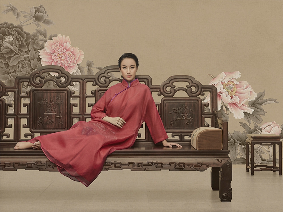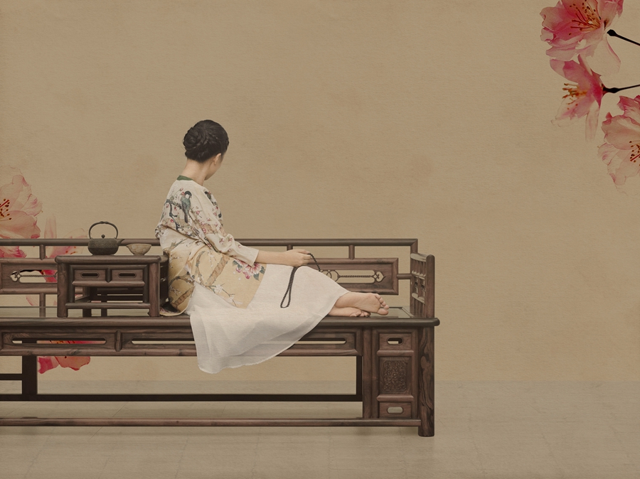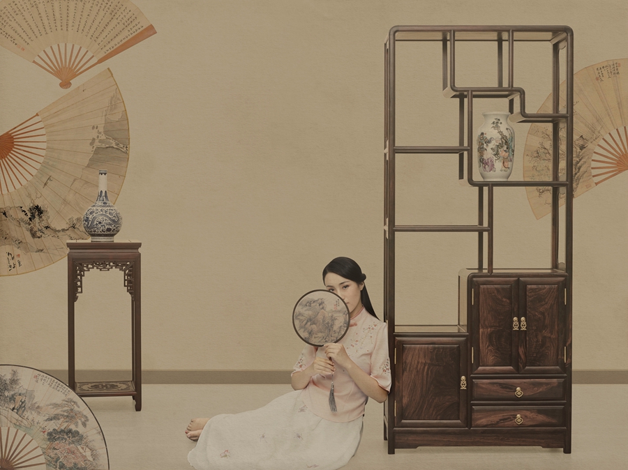 作品《千功泰祥》从作品的构思到拍摄前期的策划再到执行出片历时半年,其根据中国传统家具的特点,采用“中国工笔画”的风格,结合模特优雅的坐姿和服饰颜色,使用平面式的布光,使摄影作品不失形质神采,不动声色地凸显出产品的精致细节,以及纵深立体感,达到审美艺术和适用艺术的完美结合,以及物人和谐统一的祥和美感。