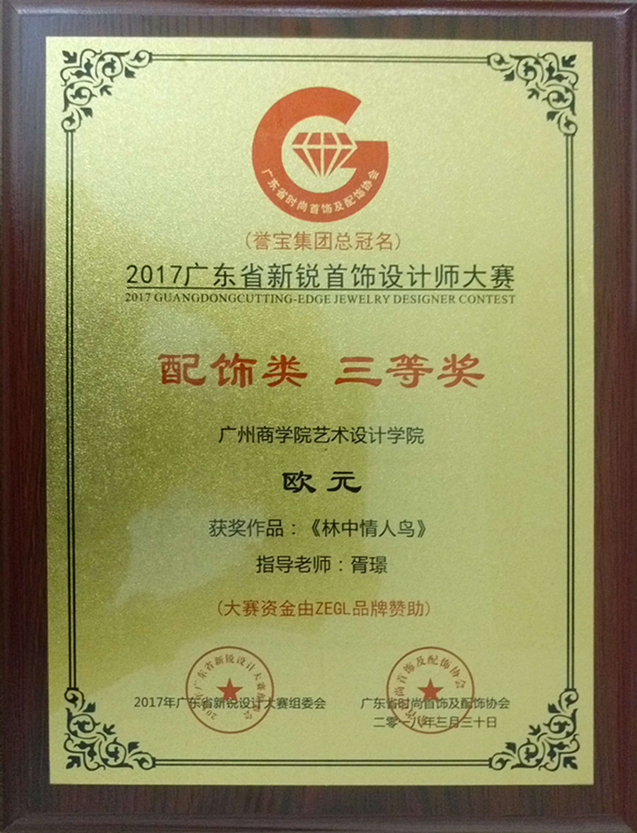 2018中国时尚首饰及配饰行业峰会暨广东省时尚首饰及配饰协会2018年会上,广东省时尚首饰及配饰协会会长邓钜晖及监事长潘旭平分别作2017年工作报告,多名企业代表针对“消费升级下产业裂变”提出了自己的观点,共同探讨在消费升级等状态下,中国饰品产业应对的措施及办法。在2017广东省新锐首饰设计师颁奖典礼上,公司bevictor伟德官网在众多参会单位中脱颖而出,荣获“优秀组织单位奖”,bevictor伟德官网副经理谭杉荣获“优秀顾问奖”,2016级产品设计专业欧元同学荣获“配饰类三等奖”。