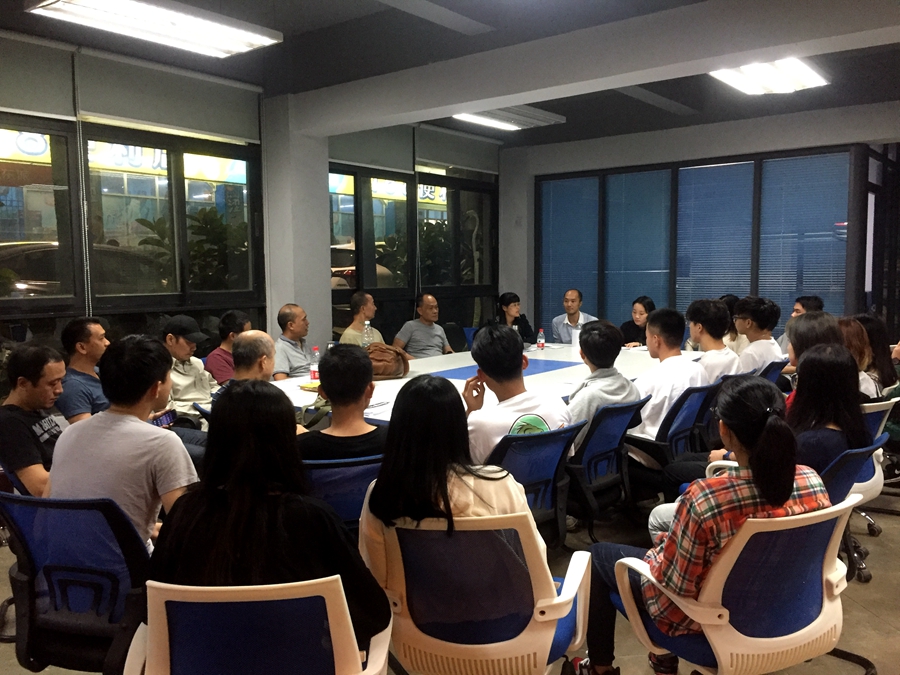 龙莉红介绍了工作室建设现状,对新加入的成员表示欢迎,对林钰源经理的指导表示感谢。林钰源表达了自己对环境设计专业员工的期待和希望,为工作室接下来的发展指明了方向。他提出,要找到一条适合环境设计专业的“振兴乡村”计划道路,响应国家号召,关注乡村生活,用设计振兴乡村;美丽乡村建设有很大的发展空间,广阔的就业前景。他同时分享了自己在苗族农村、贵州农村的所闻所见,提出广州的农村也应保留自己的特色,农村的变化不应该是设计师心目中的样子,而应该是原著居民心目中的样子,要尊重当地的文化内涵和民风民俗,做从本土生长出来的设计。林钰源勉励同学们“人生要靠自己努力”,要沉下心好好学习,提升自己的文化底蕴,了解自然科学的常识,要有前卫的审美眼光,提升自己的眼界,具备成为“美丽乡村”设计师的条件。黎志伟对工作室建设提出具体要求,他指出进入工作室是为了更好地学习,要有不怕苦、不怕累的精神,有“为了学习请进,赚钱请出”的理念,不同年级的同学互相学习,互相交流,拧成一股绳;从身边的项目出发,比如校园环境、公司周边农村环境、龙祥汇楼盘项目等的建筑、景观、室内空间设计,由工作室团队牵头,将大有文章可做。会上,赖伟成、祝京元等老师纷纷为工作室发展提出具体的建议。