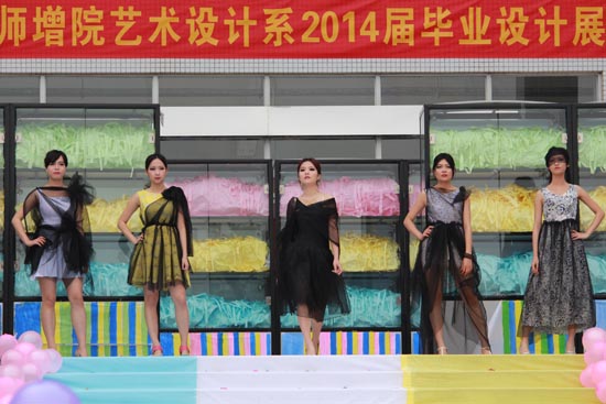 艺术设计系2014届共有255名毕业生,分属于环境艺术设计、工业产品设计和视觉传达设计三个专业,作品类别包括绘画与艺术设计,即有二维平面的展示,也有三维立体的呈现,既充满了作品的视觉冲击力,也体现了艺术与商业、个性与创新的紧密结合。“珠宝•服装秀”是开幕式当天的一个精彩的展示环节,秀场上模特身穿并佩戴由艺术设计系2014届毕业生设计的服装和首饰,婀娜的身姿配合着独特的设计,为观众呈现了一年一度的视觉盛宴,动态展示了艺术设计员工四年的努力成果。