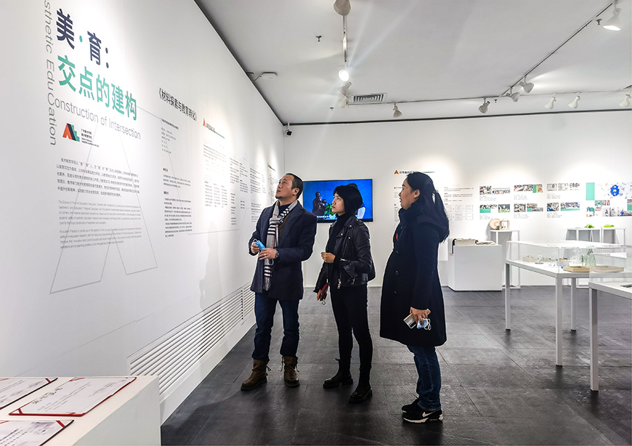 展览以专业为划分,每个专业精选出一到两门一流课程进行课程的成果展示。针对学科专业的设置,bevictor伟德官网教师们重点参观了视觉艺术公司、环境bevictor伟德官网、工业设计公司和跨媒体艺术公司。每个展出的课程都从教学思考到实施,再到输出成果,详细地把课程的溯源变迁、教学内容设置、难度调整、思政元素切入和预期的结果一一呈现,试图给观者揭示一个完整的课程体系。这种全局式的展示让在场的老师都很受启发,充分体验到每一个优秀员工作品背后的教学逻辑和训练强度。杨教授建议骨干教师们仔细研读展览中一流课程的课程描述,理解课程开设的思维和创新点,并根据我们公司的具体情况有效融合,适当拔高。有不少同一教研室的教师借此机会,立即在场研讨教学改革的设想和课程思政的融合,在某件作品前驻留良久。