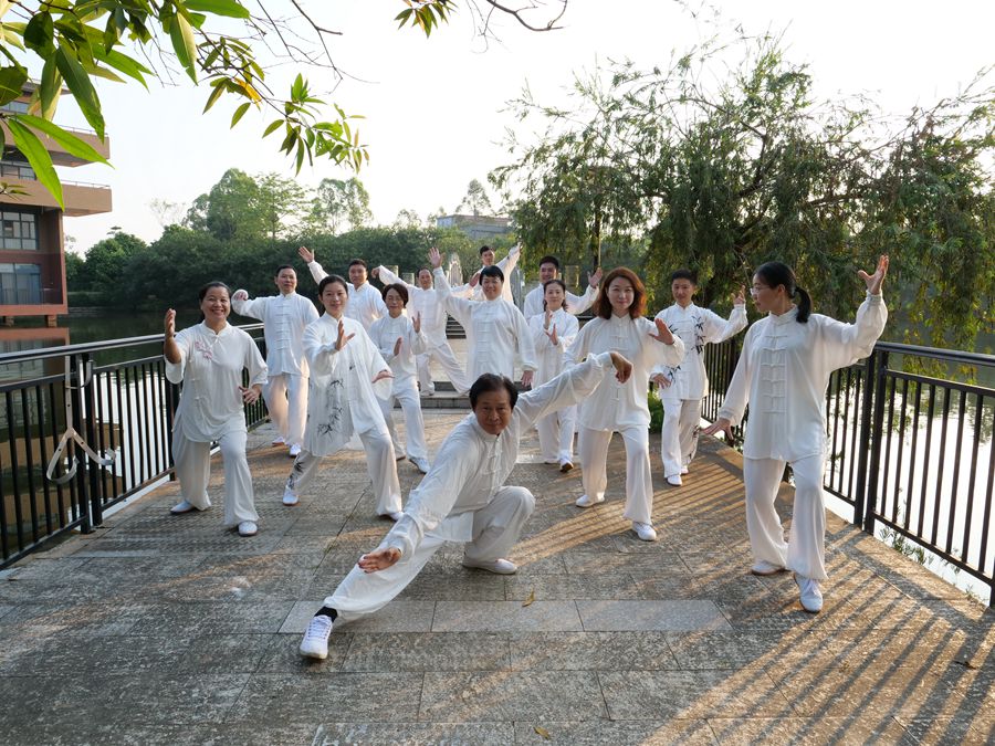 赖伟成主持多次会议讨论,数字媒体艺术教研室制定了拍摄脚本、拍摄计划、拍摄具体时间、要求、踩点等细则。整个拍摄在董事长黄弢教授、公司党委书记吕泉荣、副董事长欧洁梅等带领下,分别取景公司小东湖、校园绿道、正门及教学楼等场地,拍摄了师生晨练太极、学习及学习之余武术队训练等校园生活,通过拍摄展现校园生活的丰富多彩、浓厚的文化底蕴及风景秀丽的校园环境。在拍摄过程中还邀请了广州素觉文化有限公司欧振华、丁伟民两位工作人员,及数字媒体艺术专业2016级江婉妮、聂琪林、张扬、梁大斌、冯美义等同学参与协助拍摄。后期由数字媒体艺术教研室主任李瑞协同李天昊、寇昊、陈雁峰、黄艳完成素材挑选、后期调整、剪辑、合成、录音配音、文字校对等制作工作。通宵达旦、全力奋战,在短短一周时间内完成了“千人太极”项目进校园纪录片拍摄及制作工作。