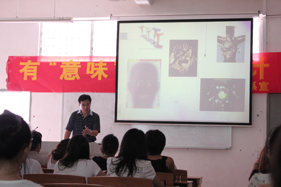 讲座于下午15::00开始,本次活动是在艺术系领导们的高度重视下举办的,以讲解视觉传达方向设计外主,为大家阐述了海报设计、插画、展示设计、包装设计等设计学创新理论,讲座从“意味”出发,由设计入手,内容生动有趣,案例丰富,引来同学们掌声不断。在最后,范教授指出:创意是意味的源泉,意味是创意的追求。使同学们都深入了解到艺术设计中“创意”的重要性。