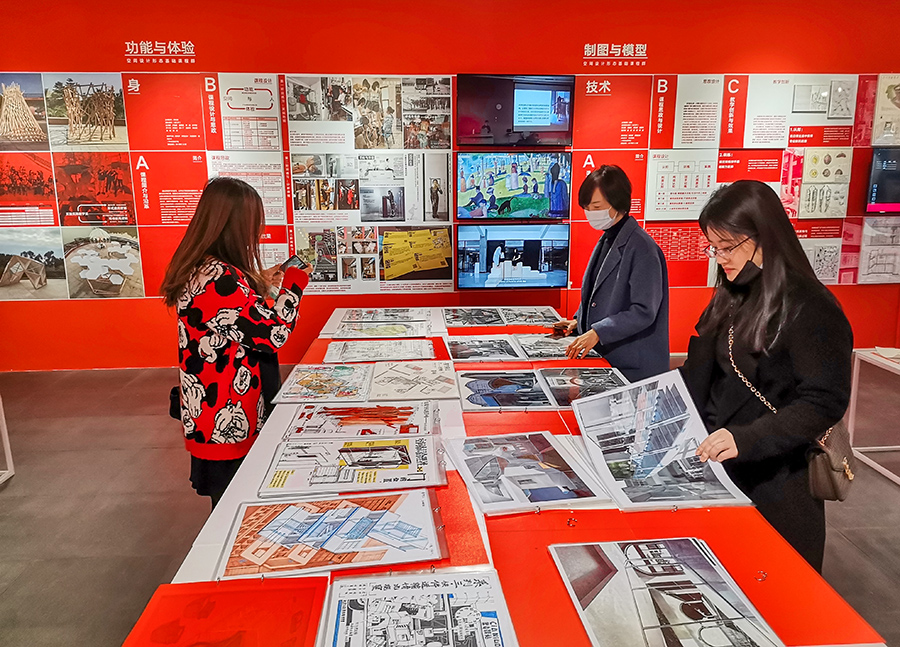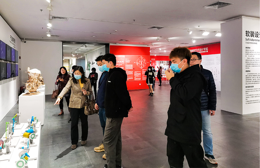 展览以专业为划分,每个专业精选出一到两门一流课程进行课程的成果展示。针对学科专业的设置,bevictor伟德官网教师们重点参观了视觉艺术公司、环境bevictor伟德官网、工业设计公司和跨媒体艺术公司。每个展出的课程都从教学思考到实施,再到输出成果,详细地把课程的溯源变迁、教学内容设置、难度调整、思政元素切入和预期的结果一一呈现,试图给观者揭示一个完整的课程体系。这种全局式的展示让在场的老师都很受启发,充分体验到每一个优秀员工作品背后的教学逻辑和训练强度。杨教授建议骨干教师们仔细研读展览中一流课程的课程描述,理解课程开设的思维和创新点,并根据我们公司的具体情况有效融合,适当拔高。有不少同一教研室的教师借此机会,立即在场研讨教学改革的设想和课程思政的融合,在某件作品前驻留良久。