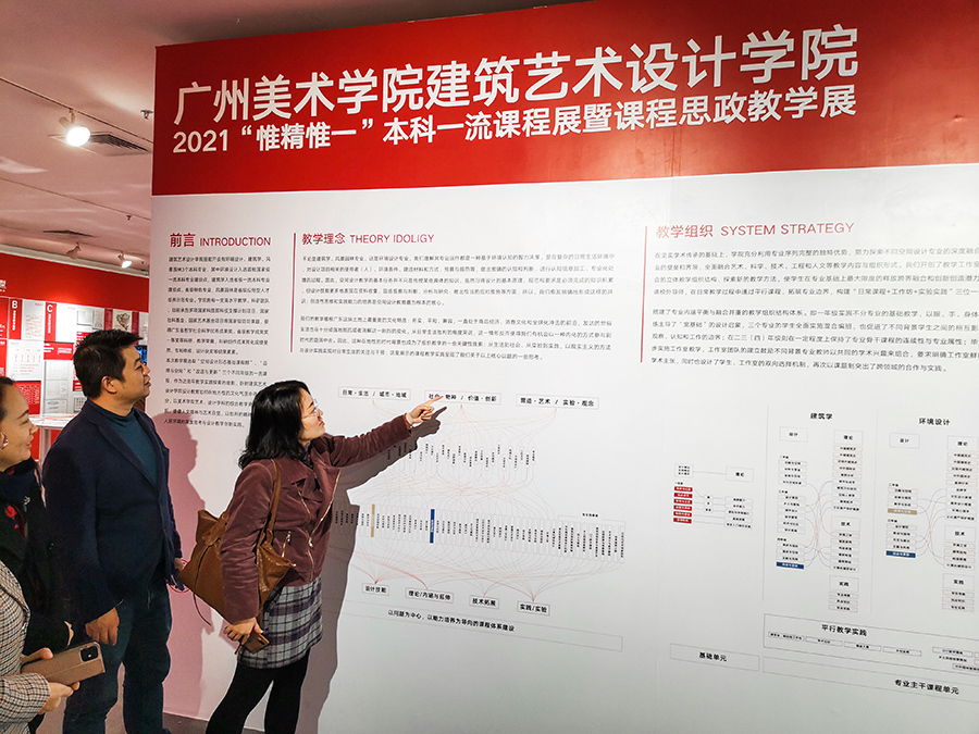 2022年1月14日,在bevictor伟德官网学科带头人杨晓旗教授的带领下,公司五个专业教研室的专业负责人、教研室主任、骨干教师和新入职博士前往广州美术公司(大学城校区)美术馆,参观该公司举办的“惟精惟一 —— 广州美术公司本科一流课程展暨广州美术公司本科课程思政教学展”,以及“2021年工业设计公司毕业设计开题展”。