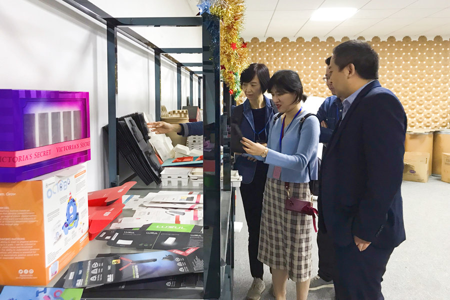 会后,张曙光带领黄明珊一行人参观了企业的办公环境、纸板生产车间与包装设计展厅。教师们对企业包装生产流程及所需人才具体需求进行了咨询了解。