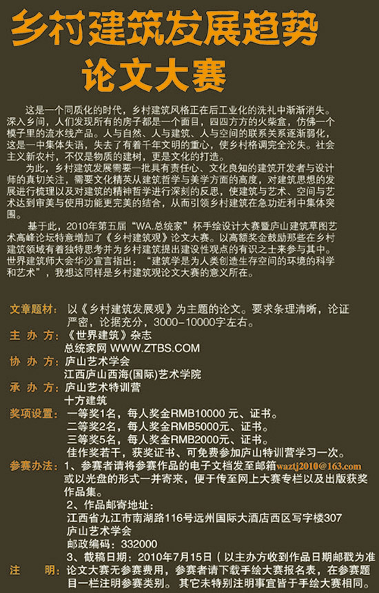 这是一个同质化的时代,乡村建筑风格正在后工业化的洗礼中渐渐消失。深入乡间,人们发现所有的房子都是一个面目,四四方方的火柴盒,仿佛一个模子里的流水线产品。人与自然、人与建筑、人与空间的联系关系逐渐弱化,这是一中集体失语,失去了有着千年文明的重心,使乡村格调完全沦失。社会主义新农村,不仅是物质的建树,更是文化的打造。为此,乡村建筑发展需要一批具有责任心、文化良知的建筑开发者与设计师的真切关注,需要文化精英从建筑哲学与美学方面的高度,对建筑思想的发展进行梳理以及对建筑的精神哲学进行深刻的反思,使建筑与艺术、空间与艺术达到审美与使用功能更完美的结合,从而引领乡村建筑在急功近利中集体突围。基于此,2010年第五届“WA.总统家”杯手绘设计大赛暨庐山建筑草图艺术高峰论坛特意增加了《乡村建筑观》论文大赛。以高额奖金鼓励那些在乡村建筑领域有着独特思考并为乡村建筑提出建设性观点的有识之士来参与其中。世界建筑师大会华沙宣言指出:“建筑学是为人类创造生存空间的环境的科学和艺术”,我想这同样是乡村建筑观论文大赛的意义所在。