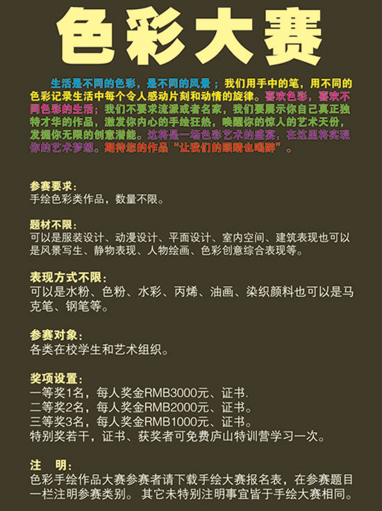 注明:色彩手绘作品大赛参赛者请下载手绘大赛报名表,在参赛题目一栏注明参赛类别。其它未特别注明事宜皆于手绘大赛相同。