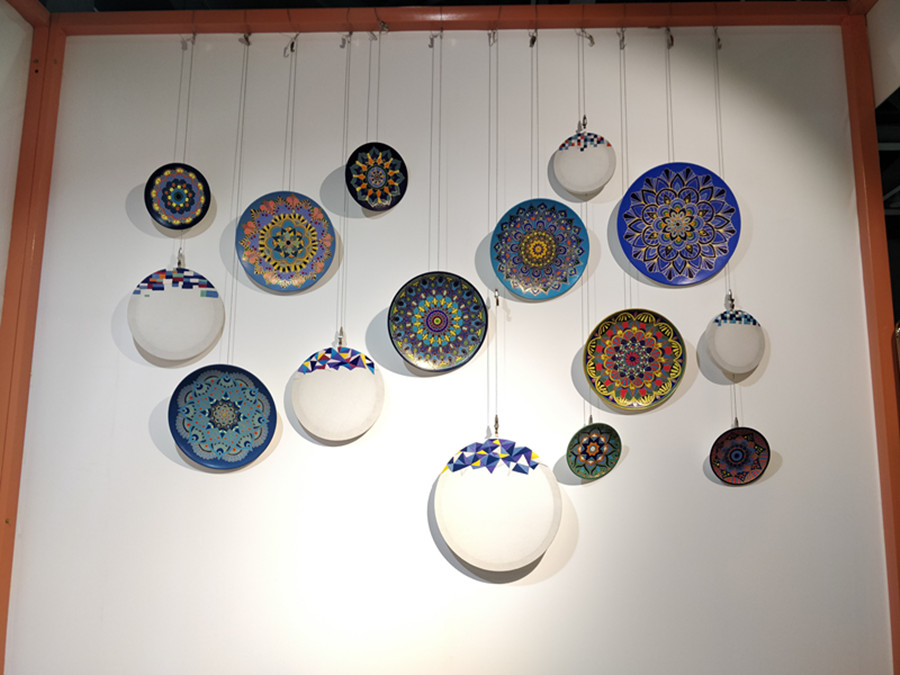 展位上还搭配了由视觉传达设计专业胥璟老师带领员工创作的装饰画作品《手绘装饰挂盘》、《刺绣装饰壁挂》、《蓝绿红黄装饰画四件套》、《梦幻装饰画五件套》;由产品设计专业潘梦梅老师创作的《几何》陶瓷装饰摆件、《屋顶》花器,员工创作的《大象》、《犀牛》等陶艺作品,为家具展增色加彩,获得参展商与观众的纷纷好评。