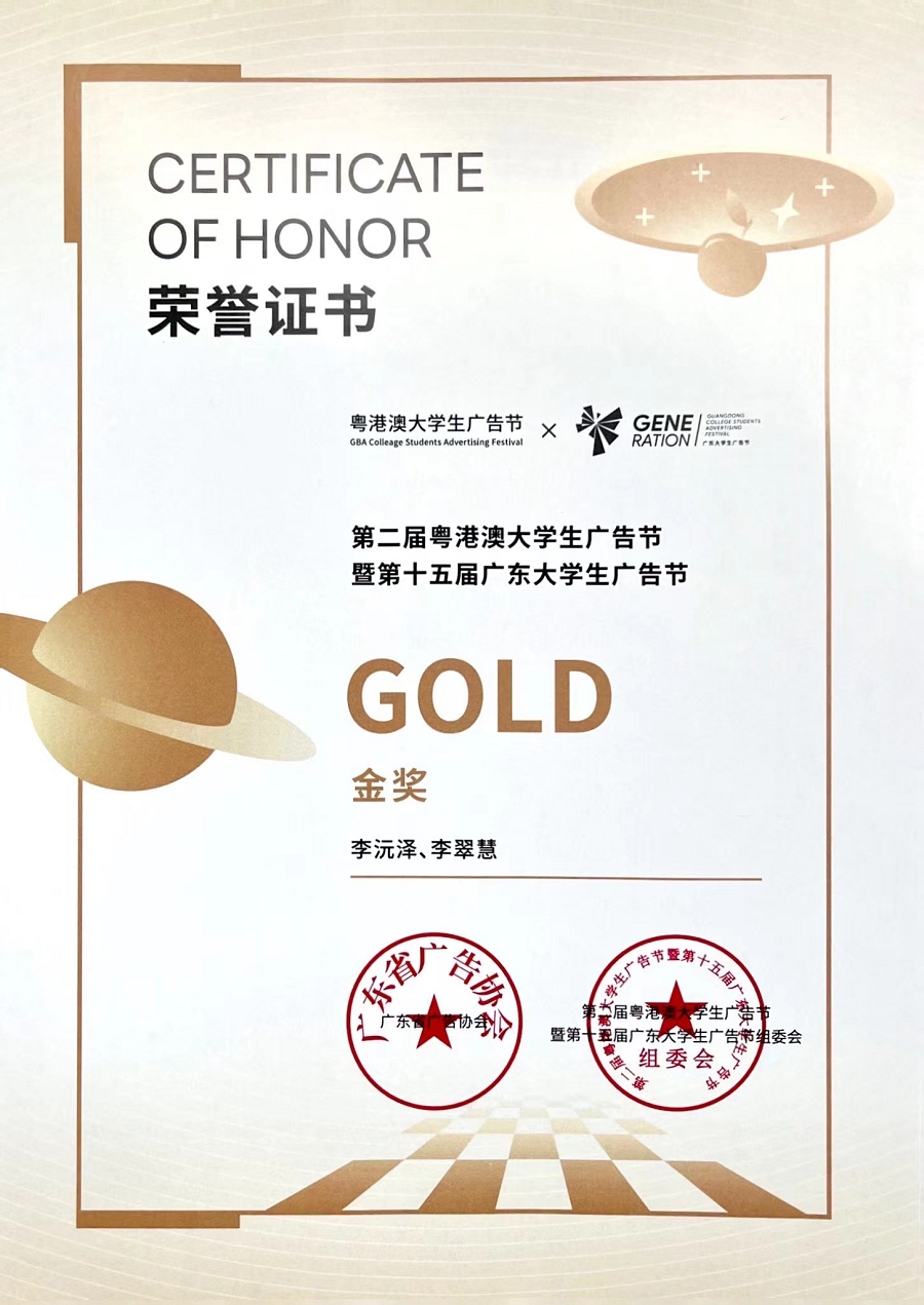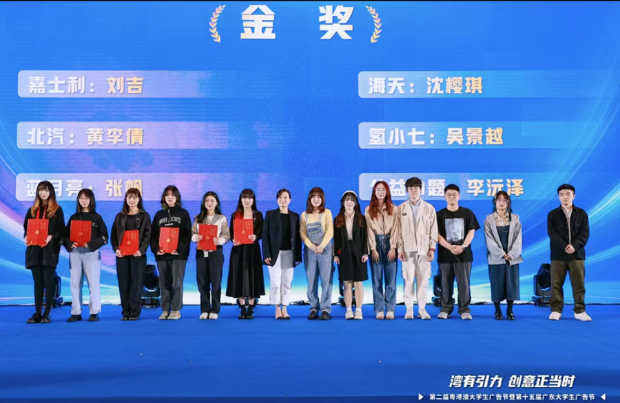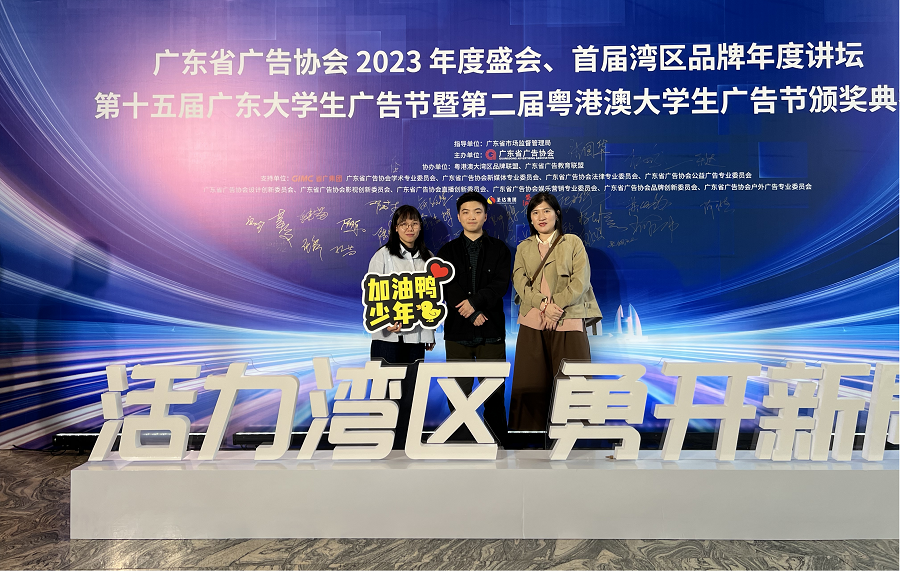 近日,bevictor伟德官网李嘉欣、罗靖导师带领数字媒体艺术专业李元泽员工出席2022年粤港澳老员工广告节暨第十五届广东老员工广告节颁奖典礼。本次大赛各项赛事活动已圆满完成,韦德官方网站作为参赛院校之一收获了丰硕的教学实践成果,并斩获公益主题平面金奖。同时本次典礼中举办了广东省广告协会盛会,大力宣传广告法律法规、行业规范等重要资讯,为师生提供了难得可贵的学习平台。