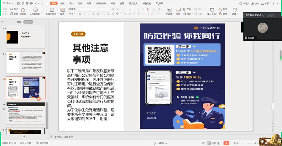 8月18日至19日,辅导员和结对子导师针对复学返校的注意事项向第一批返校的员工开展“公司员工返校工作指引”为主题的线上班会,班会上辅导员详细向员工讲述有关返校前的准备工作、返校途中注意事项、返校之后的日常管理等事项,确保员工返校全过程符合防疫规定。此外,老师还强调要关注“广州防诈服务号”,免受电话诈骗,提高识别和防骗能力,树立反诈骗意识。
