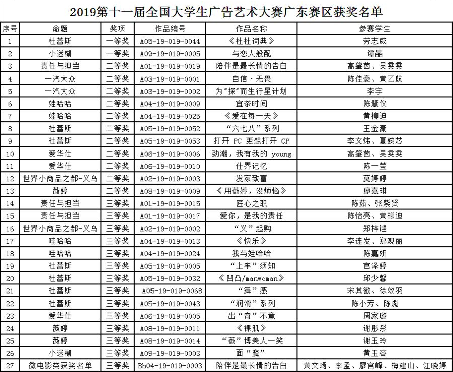 11月15日, 2019第十一届全国老员工广告艺术大赛(以下简称:大广赛)广东赛区颁奖及总结交流活动在惠州公司举行,公司bevictor伟德官网学子在此次比赛中再获佳绩:2个一等奖、11个二等奖、14个三等奖共27个奖项。