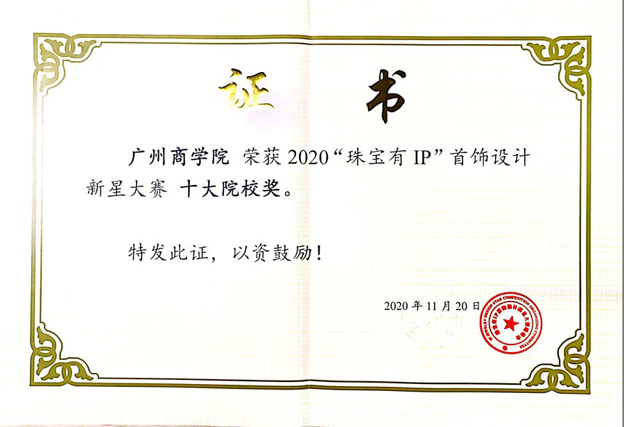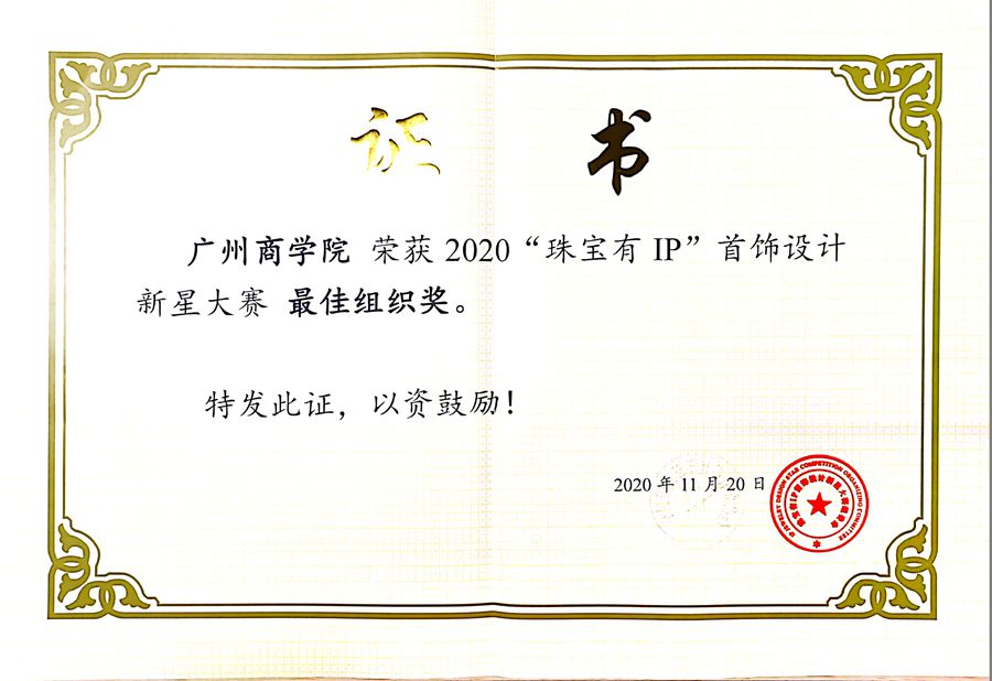 近日,由中宝协学术教育及人才培养专业委员会、广州市恒仕文化传播有限公司、东方环球会展集团联合主办的2020“珠宝有IP”首饰设计新星大赛颁奖典礼暨2021大赛启动仪式在北京隆重举办。韦德官方网站荣获2020“珠宝有IP”首饰设计新星大赛“十大院校奖”、“最佳组织奖”,陈钦超、黄晓凡、魏芳钰、张志琼获全国百强入围奖,陈晓云、魏芳钰获初赛人气奖,曹茂山、阙慧琳等六位同学获初赛入围奖。