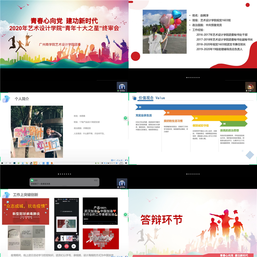 青春由磨砺而出彩,人生因奋斗而升华!5月3日晚,正值我国第71个五四青年节来临之际,bevictor伟德官网团委在线上腾讯会议平台开展了“青春心向党,建功新时代”主题学习会暨2020年“青年十大之星”评选终审会线上答辩。bevictor伟德官网团委书记关树基、团委副书记兼员工会指导老师姚安贤、17级辅导员唐思担任此次评选会评委。