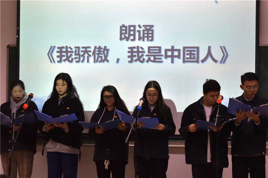 “我骄傲,我是中国人!黄土高原是我挺起的胸脯,黄河流水是我沸腾的热血,长城是我扬起的手臂,泰山是我站立的脚跟。”通过环境1802班团支部的朗诵,表达了团员青年的爱国热情和对中华人民共和国七十华诞的美好祝愿。紧接着艺术团舞蹈队带来舞蹈《金陵十三钗》,优雅的舞姿和动人的演出,展示了金陵女子的柔美、慷慨赴死的民族大义和浓厚的爱国情怀。