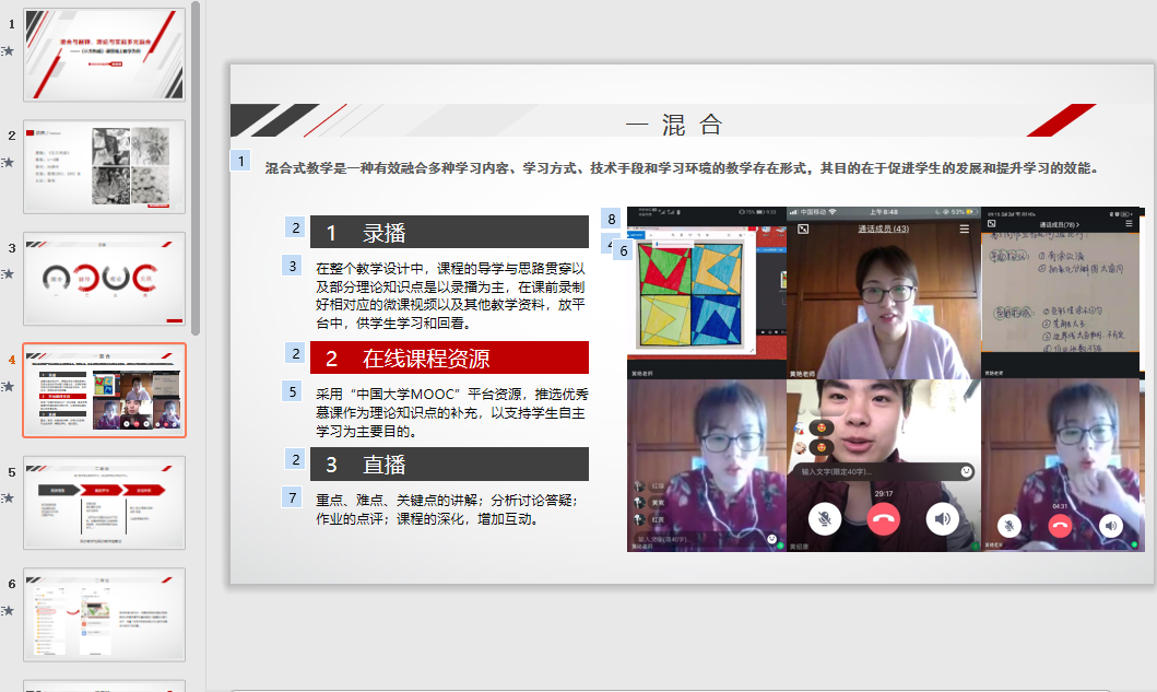 于静仪以《快速表现技法》课程为例分享多平台+线上线下混合模式教学体会,谈到通过超星平台、QQ直播、微信、中国老员工慕课、学银网、bilibili等进行网络授课,以录播为主、直播为辅,微信、QQ与员工进行一对一沟通的教学方法进行网络课程教学,受到了员工的欢迎和认可,达到了预期的教学效果。
