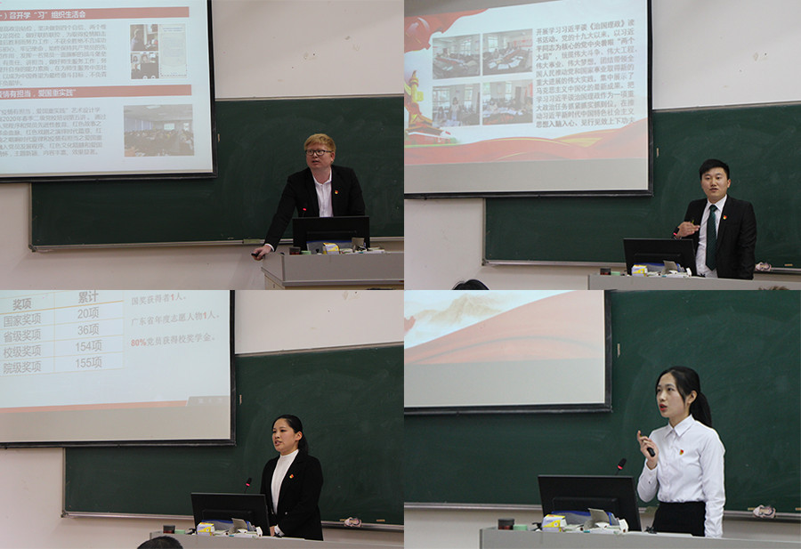 紧接着,教工党支部书记吴福珍、2017级员工党支部书记唐思、2018级员工党支部书记关树基、2019级员工党支部书记吴顺利和2020级员工党支部书记蓝喜先后上台向全体师生党员述职。其中,吴福珍汇报通过党员过政治生日、组织开展习近平新时代中国特色社会主义思想学习和组织教工党员志愿服务活动不断强化支部引领,夯实支部建设;唐思则从开展员工党员疫情防控联防联控、组织红色文化讲师团与2020级班级“结对子”开展红色文化教育等方面汇报了支部一年的建设成效;关树基以红色文化教育项目化引领、红色电影周周放、员工党员宿舍网格化管理、学习十九届五中全会和党团知识竞赛等多方面汇报了支部一年的建设成果及凝练的支部特色;吴顺利以开展红色景点员工党员实景课堂教学和红色基因传承为抓手汇报了支部一年的建设成效;蓝喜则以入党启蒙教育、与高年级员工党员“结对子”传播红色文化,营造良好的支部氛围进行了工作汇报。支部书记精彩的述职汇报得到了全体师生党员的一致认可,台下时刻响起雷鸣般的掌声。