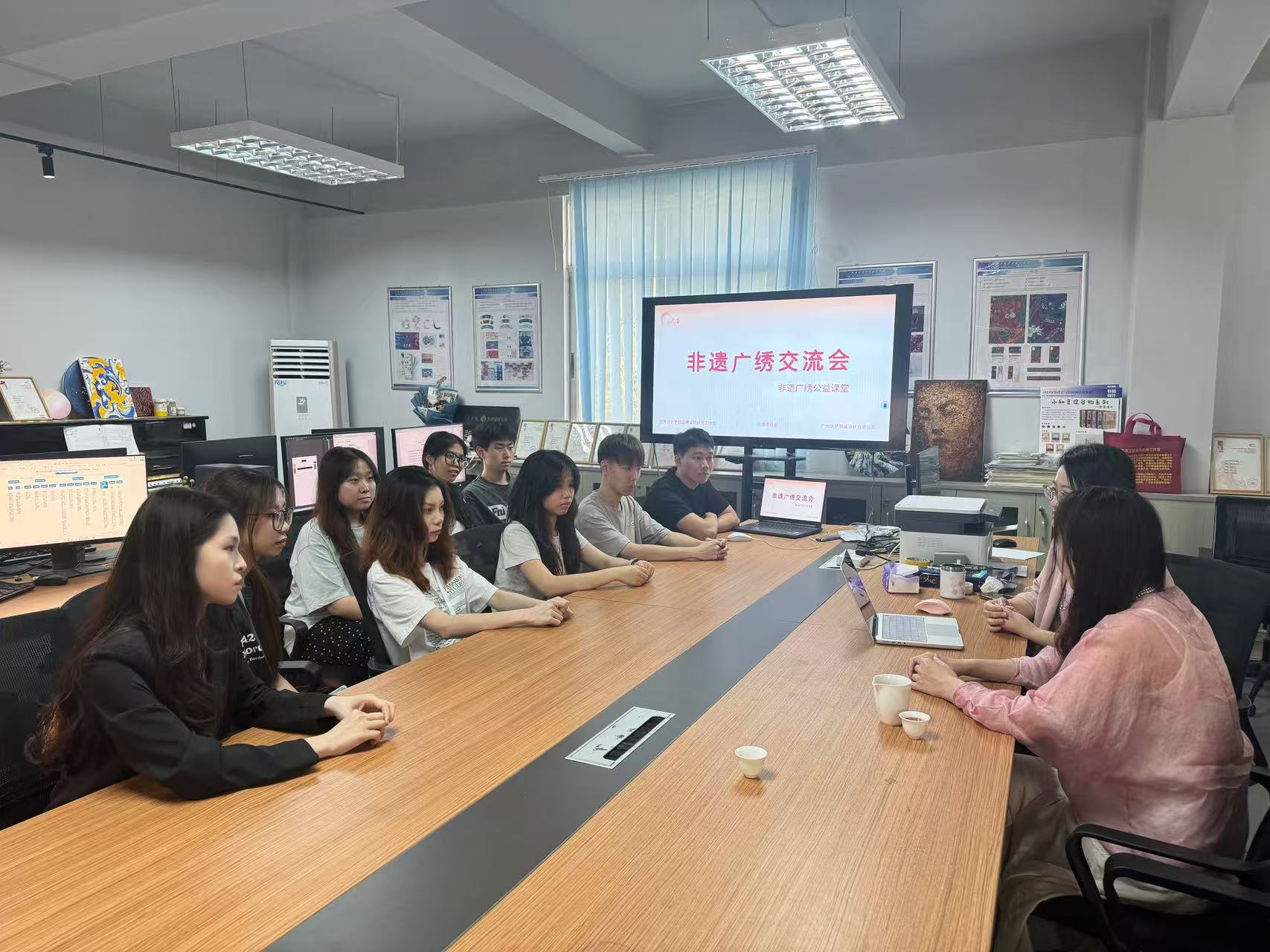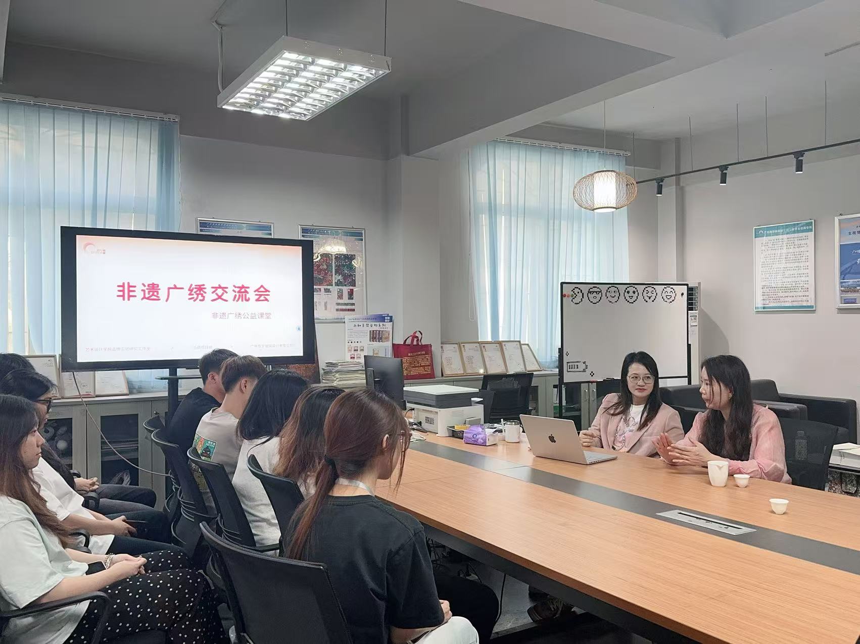 在活动的最后,广绣传承人陈乔和钟国燕副教授与同学们进⾏了互动交流,现场氛围活跃,反响热烈。她们⿎励同学们通过创新的方式活化非遗资源,激励同学们肩负起传承与创新的责任,为岭南文化符号的持续发展贡献自身力量。