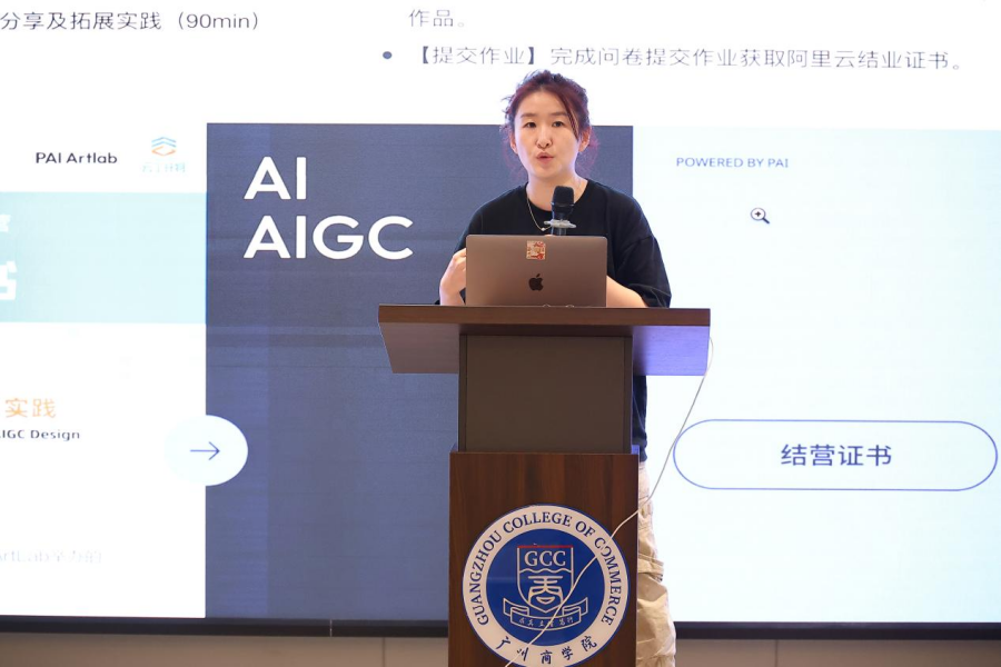 胡峻为大家带来了“云工开物”项目的宣讲。她详细介绍了云工开物项目的背景、目标及在推动高校与企业合作方面的创新实践。同时,带领同学们进行了PAI ArtLab AIGC实验。